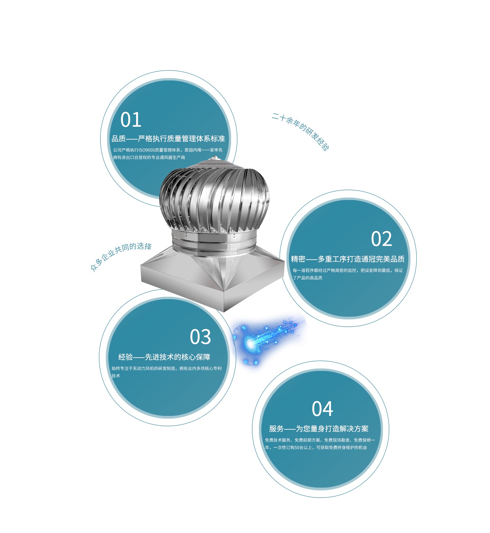 1、弧形風葉是經過科學的計算的最佳結果,能嚴格保證工作狀態無動力風機 下絕不會讓雨水侵入。排風效率高,只...